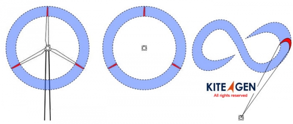 Явное преимущество технологии KiteGen визуально можно увидеть на иллюстрации выше. Основная концепция сравнима с принципом работы ветровой турбины, чьи наиболее эффективные части лопастей (отмечены красным) встречаются с самым сильным ветром. Однако с технологией KiteGen, условная лопасть вращается только по траектории, где проходят наиболее быстрые воздушные потоки, в то время как генератор остается на земле. Полученная структура и базовая часть гораздо легче и дешевле традиционных решений. Кроме того, рабочая высота может быть скорректирована в соответствии с текущими ветровыми условиями.