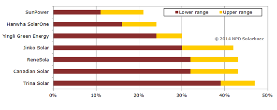 “Ведущая двадцатка поставщиков модулей на рынке фотоэлектрической промышленности, отвечает за две трети общемировых поставок — они же и обеспечивают ведущие показатели роста промышленности и тенденции ценообразования”, говорит Рэй Лиан (Ray Lian), старший аналитик NPD Solarbuzz. “Предполагая, что ведущие поставщики смогут достичь прогнозируемых темпов роста, рынок солнечной энергетики в 2014 году приблизится к отметке в 50 ГВт.”